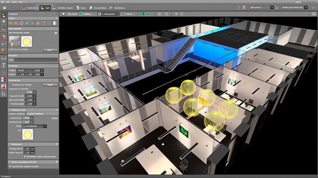 مدل سازی سه بعدی:نرم افزار DIALux به مهندسان اجازه می دهد تا یک مدل سه بعدی از ساختمان یا فضای بیرونی ایجاد کنند که می تواند برای تجسم سیستم روشنایی از هر زاویه ای و شناسایی مشکلات احتمالی قبل از نصب استفاده شود. این ویژگی به بهینهسازی محل قرارگیری چراغها و اطمینان از مطابقت سیستم روشنایی با مشخصات مورد نیاز کمک میکند.